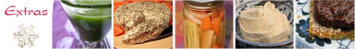 One of the great things about raw food recipes is that a salad can be reduced to make a side dish, or an appetizer can be expanded into a salad. If you need to keep the salad simple, serve up a big bowl of mixed fresh greens with your favorite dressing. Other ideas might be to make two entrees and skip the soup or appetizer. These menus are just a portion of what's available in the archive, so there are many more choices. Make transitional vegetarian feasts with both raw and cooked foods, like baked or steamed veggies, squashes, yams, and gently simmered rice, quinoa, potatoes, lentils, homemade bread, and so on. Some of our dishes can be made a day in advance, like the pickles, soup, or seed cheese, and they often become even tastier the next day. Raw soups can be warmed, or lightly cooked, to meet your needs. You may wish to begin a meal with an energizing fresh juice, and end with your favorite tea or drink. Single raw food recipes can be used to complement traditional cooked foods that are family favorites. My cousins from South Africa like to include the Festive Red Cabbage Salad as part of their holiday fare. Knowing they are making this salad bridges the miles, and brings us closer together in spirit. Our dream is to feel the joy, to savor the abundance in our lives, and to be at peace and have heart-warming, memorable experiences with family, friends, and loved ones. ![]() |