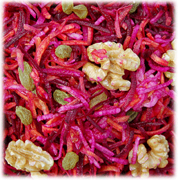 The following recipe, Festive Red Cabbage Salad, was inspired in just this way. (Read more about the creative process after the recipe.) This salad is full of beautiful holiday color and zesty crunch, and it’s even better the next day, so you can make extra for handy leftovers. (It’s also good with sprouted sunflower seed cheese - click on the archive button.) The finer you can slice the cabbage, the easier it is to chew, and the better it will digest. We find that organic brassicas - cabbage, cauliflower, broccoli - digest better than conventional varieties. Cinnamon and clove are also digestive aids, so these ingredients work beautifully with red cabbage. Fresh sliced pears are a delicious addition to the salad, and round out the meal. As always, feel free to adapt this recipe in any way to suit your special needs.